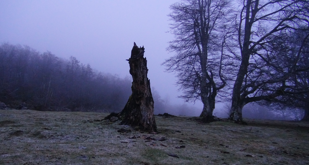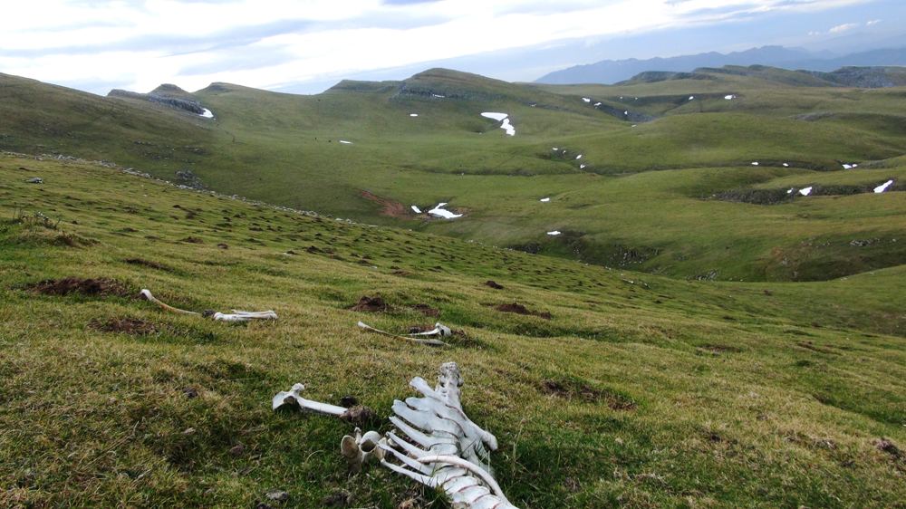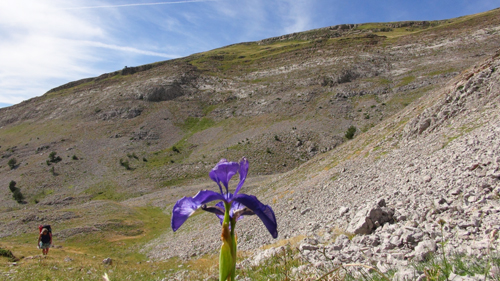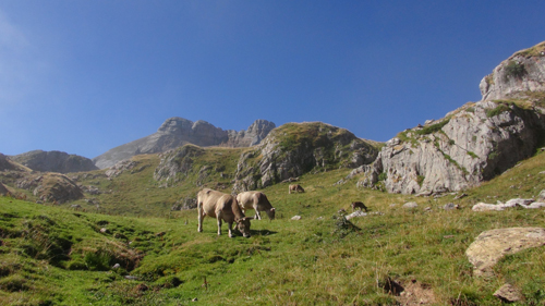 Blocking our path eastward were a pair of young bulls attempting to mate with the cows on the path itself; carefully we went around. We ate lunch in a stunted mossy beech grove and then took a wrong turn that nearly took us to the French boarder. But once we corrected our path we entered into what was probably the most beautiful part of the journey. First we walked through steep alpine meadows. Sheep grazed and the large rocks, which covered the landscape, appeared as if they had been placed there by the Jentilak. We left these steep meadows behind and came to the eaves of an ancient beech forest. The forest with its moss-clad splendor had a kind of magical feeling, and though my feet throbbed with pain, there was something revitalising about the very trees themselves, which seemed to give me the energy to keep going. We tracked along the steep mountain cliffs and came to a waterfall splashing off the mountainside. We reached slopes of scree and shingle, where shallow rooted mountain flowers and herbs bloomed – irises, buttery word, and lilies, raspberries, crocuses, and red currants. Eventually our weary feet took us away from the open cliff faces and ancient moss-filled beech forests and into fields full of wild blueberries and here we threw off our packs and made camp.