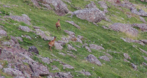 We reached the high saddle just as the first shafts of evening were beginning to illuminate the mountains in a rose light. We were rewarded for our trouble with a spectacular view of the valleys and sharp gray mountains before us. Herds of chamois gamboled through the grassy land. The rare white vultures that the Spanish call Alimoche circled in the darkening sky.