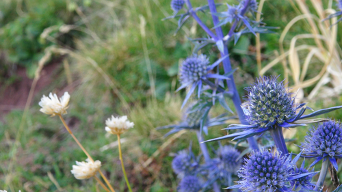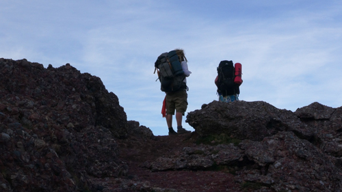 We passed the tree line and walked through a beautiful landscape of alpine flowers, small birds, grasses, lizards and bees. Soon however this landscape gave way to more rock and wind swept grass. Fatigue began to set in on our soft pink bodies. Our huge packs cut into our shoulders our rests became longer and more frequent, while the path became ever steeper and more treacherous. My breath came out in loud gasps and my was mouth dry as I begged the others for more of their precious water.