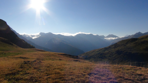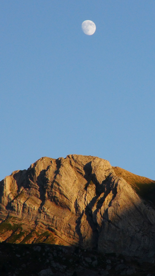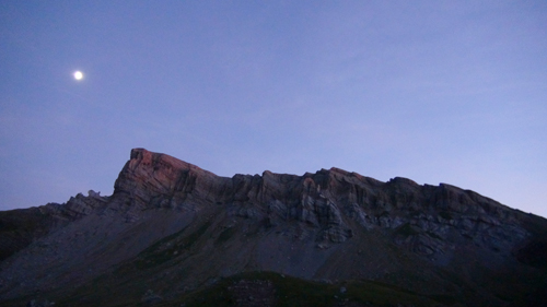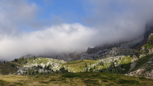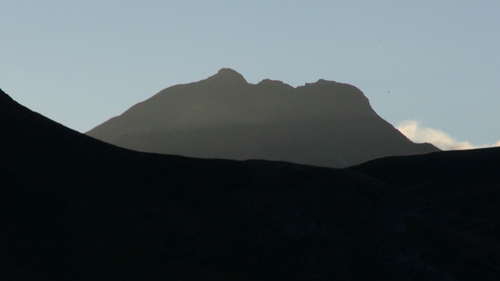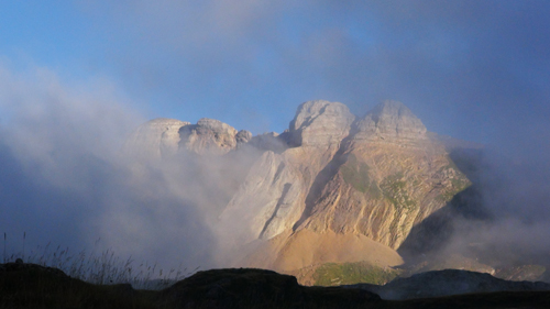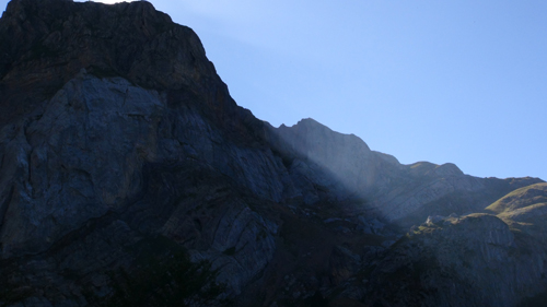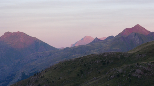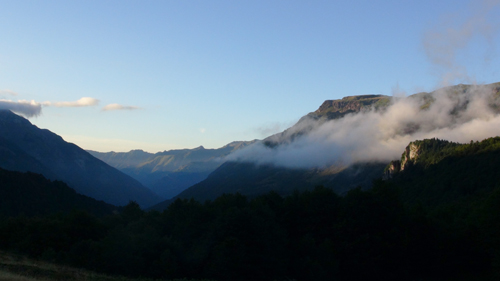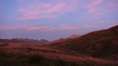 It was here we took a seemingly clear trail leading to our left. The path however petted out, and when we reached the soft alpine meadows we were lost in the ailing light. We were rescued by a camping school group, who pointed us in the direction of the right path. Here, clear springs bubbled out of the mountainside and we filled our water container with the fresh water. We drank deeply. We camped on a soft, grassy terrace. We ate our hot food, while we watched the twilight play on the faces of the mountain cliffs to the sound of the wind and the distant bells of the Pyrenean feral horses. The night was clear the stars were bright.