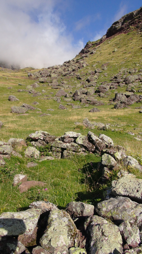 Early next morning we woke and had a breakfast of muesli and milk powder and discovered that where we had slept were old stone ruins, so old, that all that what was left was the grass covered outline of what could have been a house and a small circular structure. Perhaps they were the dwellings of medieval shepherds, or buildings from even earlier, structures of the ancient Cro-Magnon peoples, the ancestors of the Basques that lived here before even the Celtic speaking peoples came out of the east, and who left only weathered dolmans and cave paintings behind. Or Perhaps, as Basque legend tells, they were the Jentilak, the benevolent hairy giants of old who never moved from the mountains and who disappeared beneath the earth when a star foretold the birth of Christ.