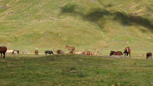 The Valley of Horses is a long tear of flat grassy land broken by a sluggish curl of water. Spread across this alpine plain were hundreds of horses and cattle. The horses and cattle of the Pyrenees are not technically wild. They have bells, so that the herdsmen may track them through the mountains (and many of them, horse and cow, will end up in a sausage). On the other hand the horses and cattle of the Pyrenees can not exactly be called tame. They wander whither they want, without fence or gate to check them. They breed As they wish, without the control of men. And in summer they run across the mountain ridges, their manes and tails blowing in the chill wind.