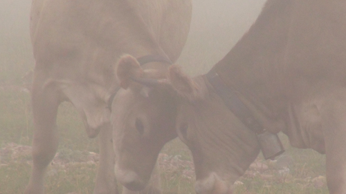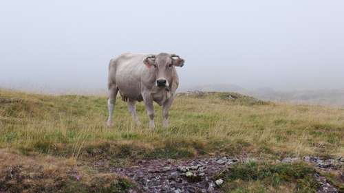 And soon we began our hike for the day. Keeping tight so we would not get lost amongst the dense damp fog, like the hobbits in the barrow downs, or run into some savage bull, for we heard amongst the mist, always, ringing bells. We climbed and climbed and as morning gave way to late morning the mist cleared. And we arrived at a popular high alpine lake, close to the boarder with France.